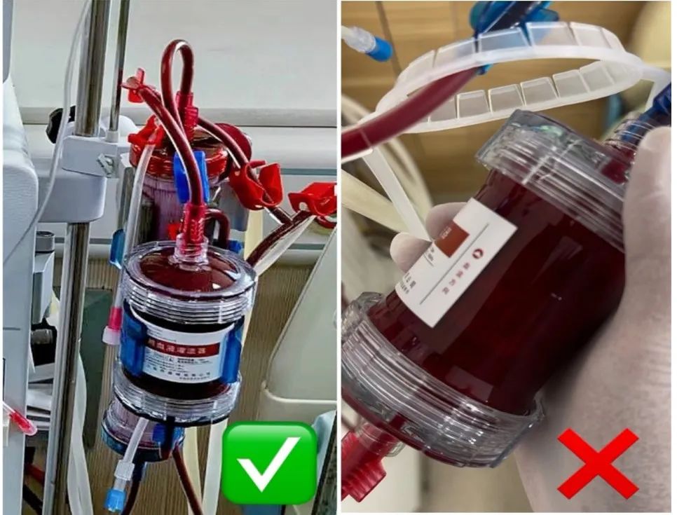 詢問患者沒有其它合并癥狀,檢查脫水總量、超濾率、以及肝素劑量等指標也均未發現問題。這時,一個操作異常現象引起我的注意:這幾例出現問題的灌流器掛放隨意,灌流器傾斜角度比較大,串聯管路打折和彎曲嚴重。其他未見異常的灌流器都使用卡鉗正確固定在機器和濾器上,灌流器保持自下而上水平垂直姿態,串聯管路也比較暢通(如圖所示)。